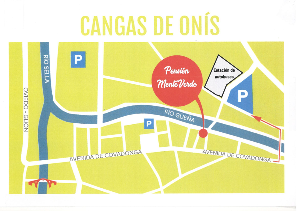 La Pensión Monteverde* se encuentra en un espacio privilegiado, cerca de todos los puntos de interés del oriente asturiano. Se localiza junto al río Gueña en una calle peatonal del centro de Cangas de Onís, junto a la iglesia y a solo 100 metros de la estación de autobuses, donde es posible usar el aparcamiento público y tomar el autobús para visitar Covadonga y sus lagos.